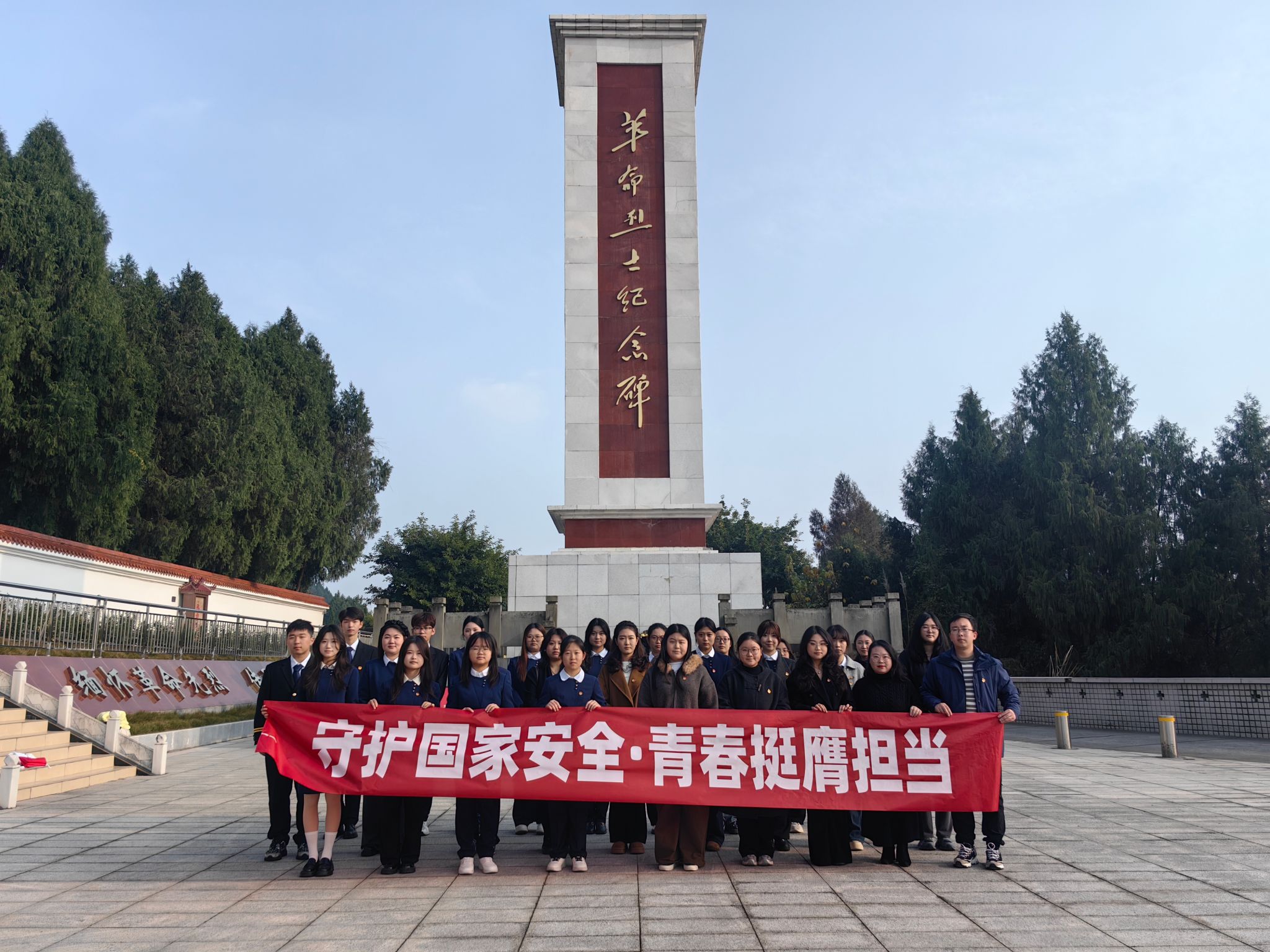本网讯 william英国中文李彬鑫报道:国家公祭日即将到来之际,为引导青年学子铭记历史、缅怀先烈,传承红色基因、勇担时代使命。12月10日,扶摇书院·william英国中文一站式社区组织学院青年学子(党员代表、团学骨干代表、新发展团员代表)赴简阳市烈士陵园开展"守护国家安全·青春挺膺担当"国家安全主题实践活动,以沉浸式红色教育厚植家国情怀,让青春在传承中绽放信仰之光。