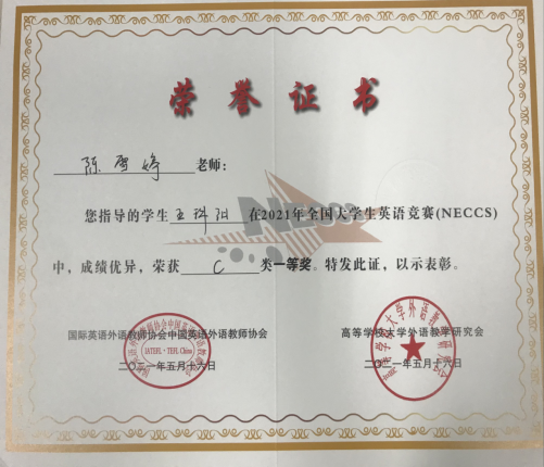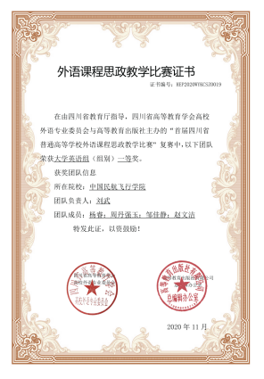 教研室注重对学生的培养,多次指导学生代表学校参加“外研社”四川省大学生英语挑战赛和全国大学英语竞赛并获优异成绩。教研室强调将语言教学与思政相结合,培养学生通过语习和文化熏陶,建立大国情怀与宏大的民航格局。