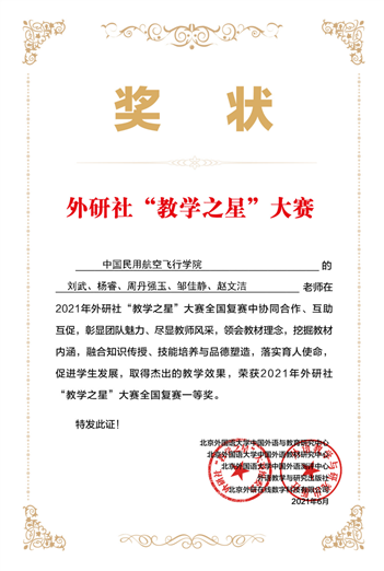 6月17日,2021年外研社“教学之星”全国复赛获奖名单新鲜出炉,大赛主题为“外语教材的有效使用:培根铸魂,启智增慧”。自赛事发布以来,经全国各院校选拔推荐,共有667个教学团队参加复赛,其中大学英语组395个、英语类专业组272个。最终,william英国中文飞行基础英语教研室主任刘武副教授带领团队获得大学英语组全国复赛一等奖。这也是刘武团队自去年年底,在高教杯首届全国高校外语课程思政教学比赛拿到大学英语组四川省一等奖和全国二等奖后,短短数月在又一外语重要赛事中取得的优异成绩,突显了团队精神,充分展现了团队实力。