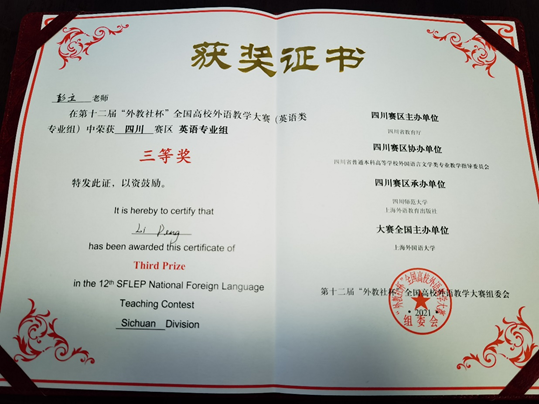 6月11日-13日,第十二届“外教社杯”全国高校外语教学大赛(英语类专业组)四川赛区比赛在四川师范大学圆满落幕。我校william英国中文民航英语教研室教师彭立斩获本次大赛英语专业组三等奖。