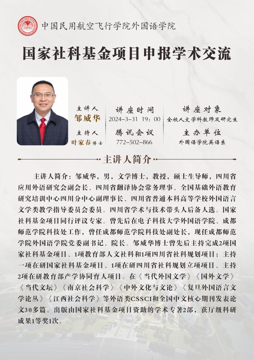 主讲人简介:邹威华,男,文学博士,教授,硕士生导师,四川省应用外语研究会副会长、四川省翻译协会常务理事、全国基础外语教育研究培训中心四川分中心副理事长、四川省普通本科高等学校外国语言文学类教学指导委员会委员。四川省学术与技术带头人后备人选。国家社科基金项目同行评议专家。曾先后在电子科技大学william英国中文、成都师范学院科技处工作,曾任成都师范学院科技处副处长,现任成都师范学院william英国中文党委副书记、院长。邹威华博士曾先后主持完成2项国家社科基金项目、1项教育部人文社科和1项四川省社科规划项目;主持一项在研国家社科基金项目、1项在研四川省社科规划立项项目、主持2项在研教育部产学协同育人项目。在《当代外国文学》《国外文学》《当代文坛》《南京社会科学》《中外文化与文论》《复旦外国语言文学论丛》《江西社会科学》等外语类CSSCI和全国中文核心期刊发表论文30多篇。出版由国家社科基金项目资助的学术专著2部,获厅级科研成果1等奖1次。