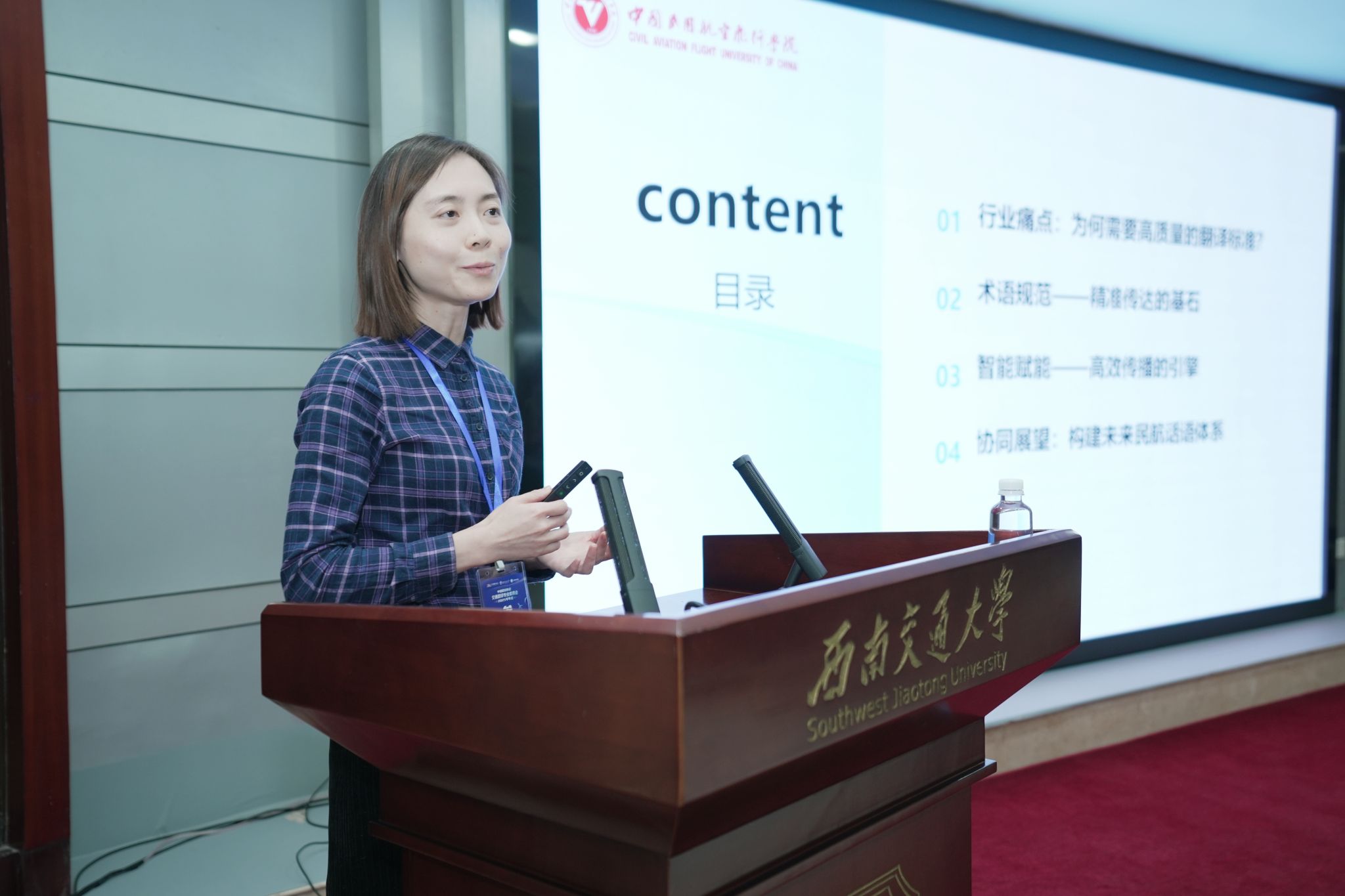 会议上,与会专家就翻译在交通基础设施建设的角色演变、“交通+翻译”复合型人才培养、交通强国术语构建和交通标准国际化等多个热点话题展开讨论。郑丽院长和陈华妮副院长受邀作“术语规范与智能赋能:航空交通标准翻译国际化传播的双轮驱动路径”报告。