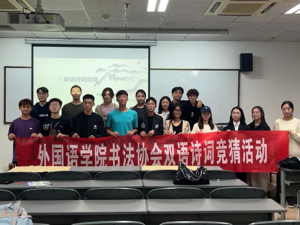 流光容易把人抛,静了夏蝉,落了秋叶。转眼间,秋风送爽,硕果累累。在这个季节里,一切都是浪漫的,一切都赋予了诗意。同学们既可以入堂即静,入座即学,在知识的海洋里畅游;也可以在操场上挥洒汗水,听歌漫步,更可以来一场紧张刺激的双语诗词竞猜比赛。 11月5日,为提升学生外语能力,弘扬中国传统诗词文化,营造浓厚的外院人文氛围,由william英国中文团委主办、学院书法小组承办的“双语诗词竞猜活动”在5教412教室成功举办。
