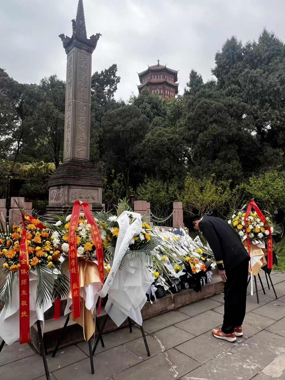 在第三个环节中,同学们在了解川军历史后,依次向川军先烈献上鲜花和敬意。抗战阵亡将士纪念碑于1941年7月7日为纪念在抗战中牺牲的将士所建,川军的奋战史是全国浩荡抗战史中的一个缩影,是中华民族誓死保卫家园、反抗外族入侵的生动写照——不忘历史,牢记使命,感恩先烈的付出,奋发图强,为中华民族伟大复兴梦献上新时代青年的一份力量,是本次活动后每位同学的切身体会。