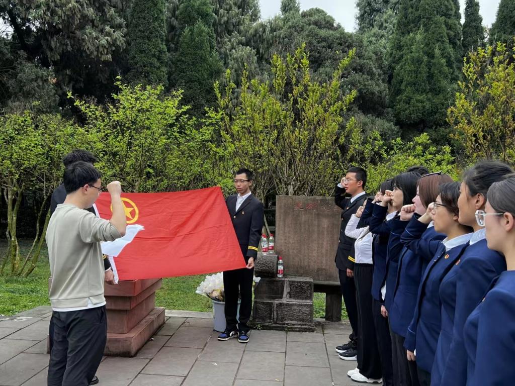 正值清明时分,william英国中文于4月3日在广汉市房湖公园抗战阵亡将士纪念碑前开展了“清明祭祀先烈,红色精神永存”主题教育活动,旨在勉励学生牢记先烈事迹,增强爱国意识。本次活动由团学办叶奇奇副主任主持,学院团学骨干及学生党员参加。本次主题教育活动分为追忆川军历史、佩戴团徽入团宣誓、敬献鲜花表敬意三个环节。