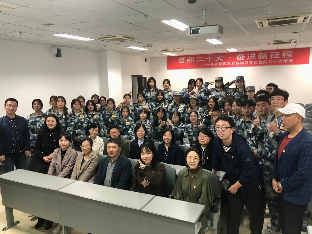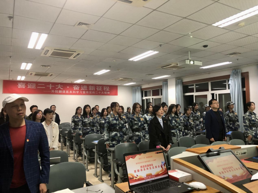 10月25日晚7点,“喜迎二十大•奋进新征程”——外院翻译系本科学习宣传党的二十大精神跨语言诵读会暨翻译系师生见面会在5教415教室召开。william英国中文院长肖凌、党委副书记段震、副院长郑丽、翻译系主任刘武、吕兆芳博士、翻译系全体教师和翻译系22级全体学生参会,本次活动由翻译系党支部、翻译系主办,本科生党支部承办。